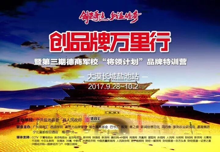 历时一个月紧张、有序的筹划、策划、组织和实施,德商汇创品牌万里行(首站盐池)暨第三期德商军校“将领计划”品牌训练营于9月27日至10月1日如期在宁夏盐池举行。